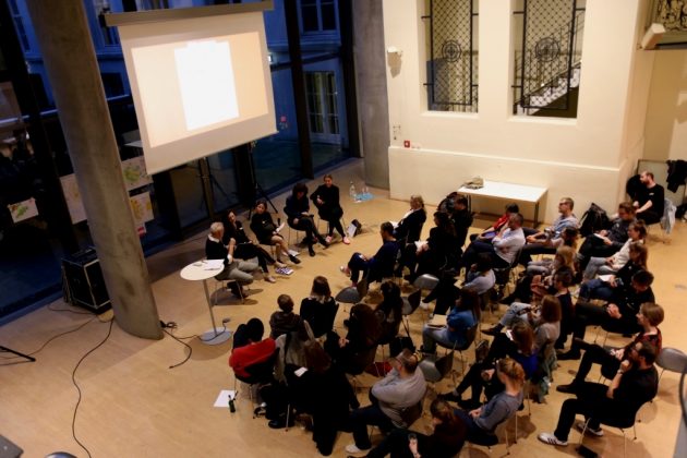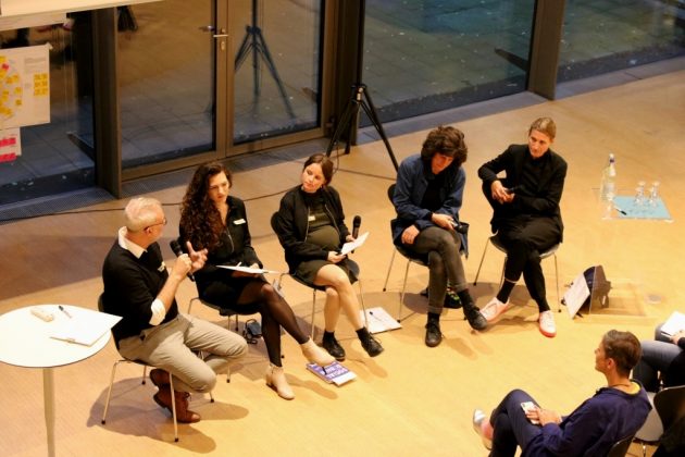 Nach dieser intensiven Arbeitsphase folgte eine Podiumsdiskussion in der Akteur*innen und Prozessgestalter*innen aus der Praxis ihre Projekte vorstellten: Mona Mijthab sprach über ihre mobile Toilette Mosan und u.a. über das Arbeiten mit Menschen in Guatemala, Daniel Kerber sprach darüber, wie er mit seinem Sozialunternehmen More Than Shelters Innovation in Flüchtlingsunterkünfte aber auch Quartiere bringt, Johanna Padge von Construct Lab erzählte von der Herausforderung eine Nachbarschaft rund um das Museum für Kunst und Gewerbe in einen Prozess zu bringen, um einen Platz, der vor allem durch eine Einrichtung für Suchtkranke geprägt ist, zu verändern und Amélie Klein sprach von ihrer Arbeit als Kuratorin und stellte Bezüge zur Designtheorie (u.A. von Victor Papanek) her. Moderiert wurde der Abend von Caroline von Eichhorn, welche die Podiumsgäste auch immer wieder mit kleinen Gestaltungsaufgaben herausforderte.