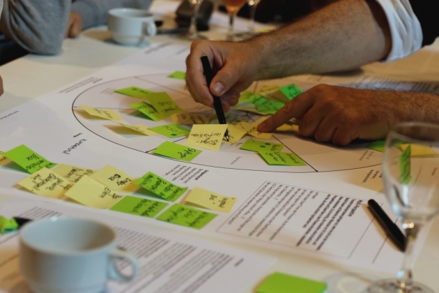 Um den rund 30 Teilnehmer*innen auch eine konkrete und übertragbare Anwendung dieses Prozessmodells zu ermöglichen, wurden drei Herausforderungen aus den Bereichen Bildung, Circular Society und Integration von Barbara Lersch vorgestellt und anhand deren eine sogenannte „Multi-Stakeholder-System Map“ erarbeitet. Diese dient dazu, das Netzwerk und die betroffenen Akteur*innen rund um die Herausforderung zu mappen aber auch kennenzulernen, um diese in einen partizipativen Prozess zur Findung möglichst nachhaltiger Lösungen einzubinden. Wichtig dafür sind die verschiedenen Perspektiven und die genaue Betrachtung derjenigen, die meist nicht auf den ersten Blick Teil des Akteursnetzwerks sind. Im Anschluss an das Mapping wurden in einem letzten Schritt erste Ideen gesammelt, mit welchen Maßnahmen (Veranstaltungen, Workshops, Vernetzungsmomente) so ein Prozess angestoßen werden könnte.