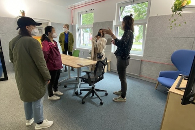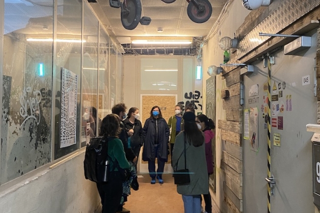 Auftakt zum zirkulären Wochenende bildete ein Stadtspaziergang zu Orten zirkulärer Praxis in Berlin. Dabei näherten wir uns in Führungen über die unterschiedlichen Gelände und in Gesprächen auf den Wegen an, was Zirkularität in Stadt und Alltag konkret bedeuten kann. Wir entdeckten und diskutierten im C2C Lab, welche Rolle Zertifizierungen für Zirkularität spielen und wie kreislauffähige Materialien und Produkte in Gebäuden und Sanierungen eingesetzt werden können. Im Haus der Materialisierung besichtigten wir Räume zum zirkulären Ausprobieren und Mitmachen und erfuhren, welche Techniken und Materialien dafür notwendig, aber auch, mit welcher Kreativität unterschiedlichste Gruppen bereits an der konkreten Umsetzung von kreislauffähigen Praktiken arbeiten. An der Floating e.V. wurde Zirkularität in Lebensräumen zwischen menschgemachter Umwelt und Natur als Erholungsraum erfahrbar und inspirierte uns der künstlerische Umgang mit zirkulären Praktiken. Dabei war der Austausch zwischen den Teilnehmenden und Inputgeber*innen auch zwischen den Stationen insbesondere bereichernd. Damit wurden Zirkularität und Orte zirkulärer Praxis auf unterschiedlichen Ebenen erfahrbar: Sowohl im persönlichen Gespräch, als auch auf struktureller Ebene zwischen den Stationen sowie auf künstlerisch-ästhethischer Ebene wurden Zugänge und Möglichkeiten sichtbar.