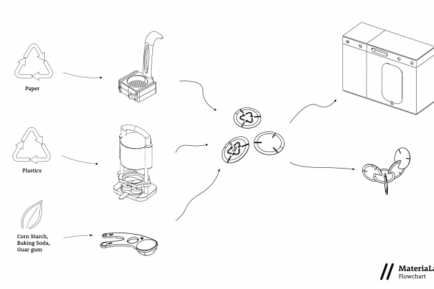 »MateriaLab« sind Experimentierkästen zum Thema Abfall und Recycling für Kinder. Das Set bietet jungen Schülerinnen und Schülern die Möglichkeit, verschiedene Recycling- und Abfallprozesse selbst durchzuführen. Das System besteht aus vier Holzkisten: Mit der Papier- und der Kunststoff-Kiste können die Kinder selbst mit speziellen Werkzeugen recyceln und aus den gewonnenen Wertstoffen kleine Scheiben erzeugen. Das Biokunststoff-Experiment lädt dazu ein, einen Stärke-basierten Biokunststoff selbst herzustellen und daraus eine weitere Scheibe zu machen. Im Biomüll-Experiment werden die Proben schließlich mithilfe von Würmern in einem zweimonatigen Langzeitversuch auf ihre Haltbarkeit getestet. Die entstandenen Scheiben dienen den Kindern als Bausteine oder als Erinnerungsmedaille.