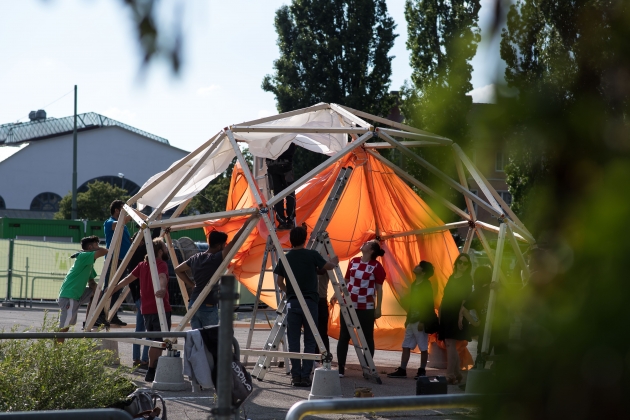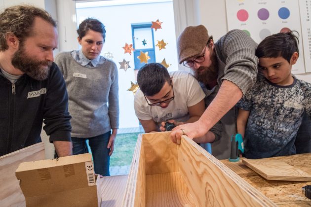 Im Zusammenhang mit der Flüchtlingswelle des Jahres 2015 entstand die Idee, in einer Erstaufnahmeeinrichtung in München eine Holzwerkstatt einzurichten, um dort gemeinsam mit den Bewohnern*innen Möbel für den täglichen Bedarf zu bauen, die Ausstattung vor Ort zu verbessern und interkulturellen und sozialen Austausch zu befördern. Neben der Hans Sauer Stiftung unterstützten das Projekt die Akademie der bildenden Künste München (Prof. Maria Auböck/Lehrstuhl für Gestalten im Freiraum), die Landeshauptstadt München sowie der Caritasverband der Erzdiözese München und Freising. In einer zentral gelegenen Unterkunft wurden ab März 2016 über mehrere Monate hinweg Bedarfsmöbel, Außenraummöblierung – vom Hocker bis zum Fußballtor – geschreinert. Werkstatt und Entwürfe waren auf einfache Handwerkzeuge ausgelegt und somit auch für ungeübte Teilnehmer*innen umsetzbar. Als niedrigschwelliges Beschäftigungsangebot und Möglichkeit, sich auch mit anderen Menschen auszutauschen, wurde das Angebot gut angenommen und bereicherte die Unterkunft sowohl infrastrukturell als auch sozial. Auf Grund der Schließung der Unterkunft, musste bald eine neue Wirkungsstädte für den werkraum gefunden werden.